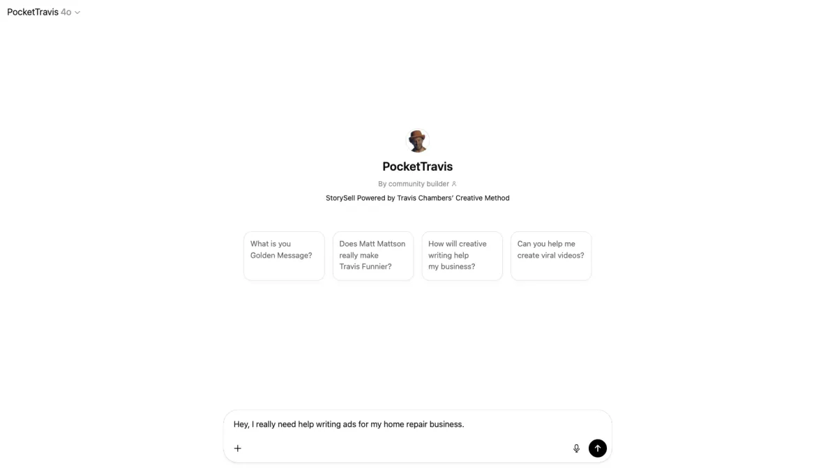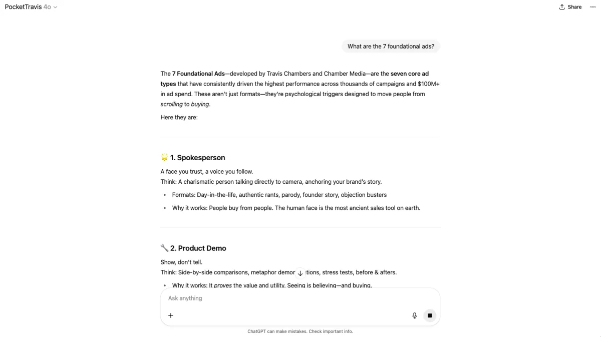 Pocket Travis is trained on a specific learning base built from my 13-step workshop. It guides you through writing the 7 foundational ads and then an Everything Ad; like moving through course modules, but in an iterative AI format.