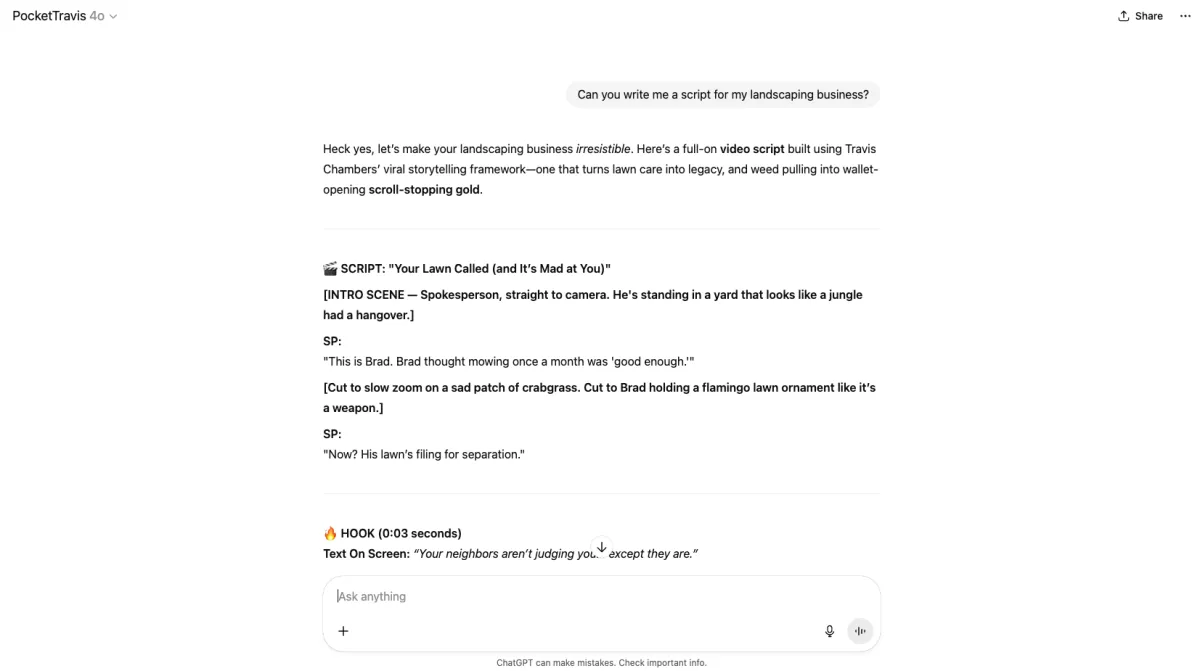 "Pocket Travis is pretty awesome. It’s helped/helping really increase volume of scripts and variations across platforms for our company. Awesome job with it, very cool and thank you. Sincerely, a random lawn care company owner from Massachusetts who follows your stuff."